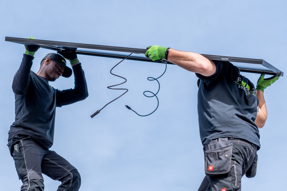 Zwei Arbeiter mit Handschuhen heben gemeinsam unter einem klaren blauen Himmel ein Solarpanel hoch.