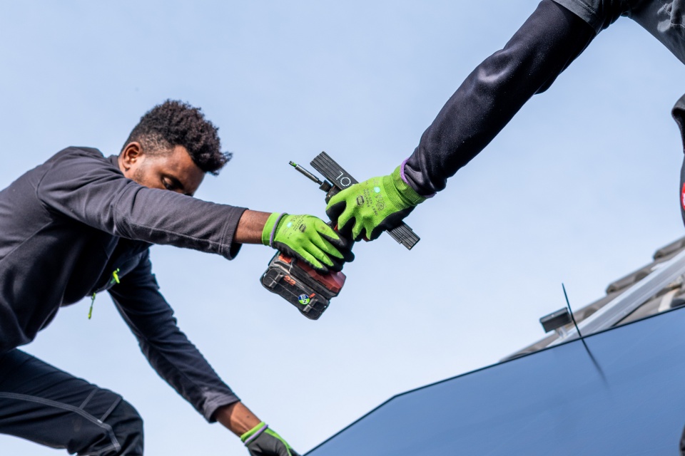 Zwei Arbeiter in grünen Handschuhen installieren auf einem Dach ein Solarpanel, wobei einer dem anderen eine Bohrmaschine reicht.
